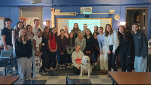 A minute after the bell signaled for class to begin, students from two Peer to Peer Connections classes were already sitting at tables in the classroom waiting to see Bentley, the six-year-old therapy dog. Once they saw the teacher use a harness to bring the golden retriever into the room, many students said, “Awww, he’s so cute.”